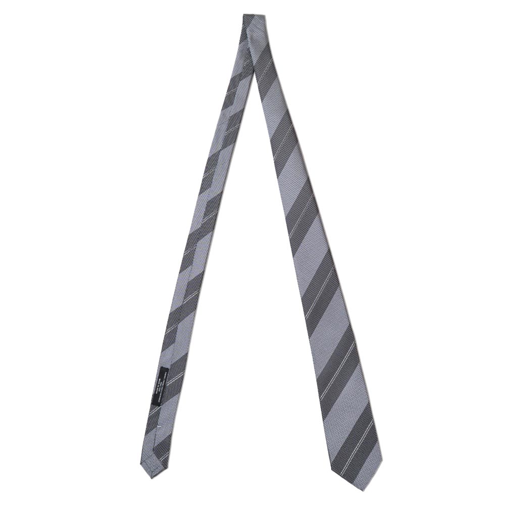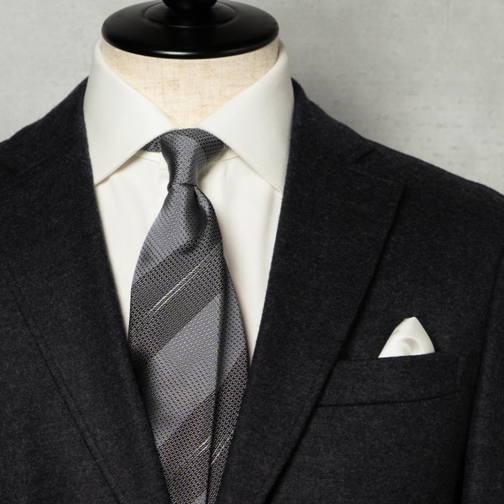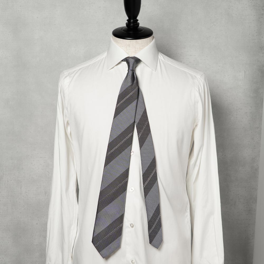 普遍的なデザインの中に、織物工房の矜持を閉じ込めた一本。太い縞と細い縞がリズミカルに配置され、それぞれの面は異なる織り組織で構成されています。凹凸のある面と、サテンのように滑らかな面が異なる光沢を放ち、静かながらも豊かな表情を見せてくれます。