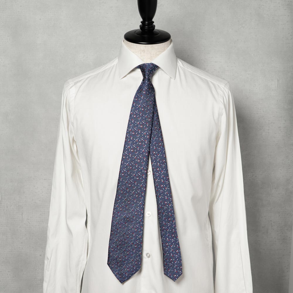 ディープネイビーの地に、赤とシルバーの小さな点が散りばめられています。緻密なジャカード織りだからこそ表現できる、細やかでランダムな点の配置がモダンな煌めきを与えます。