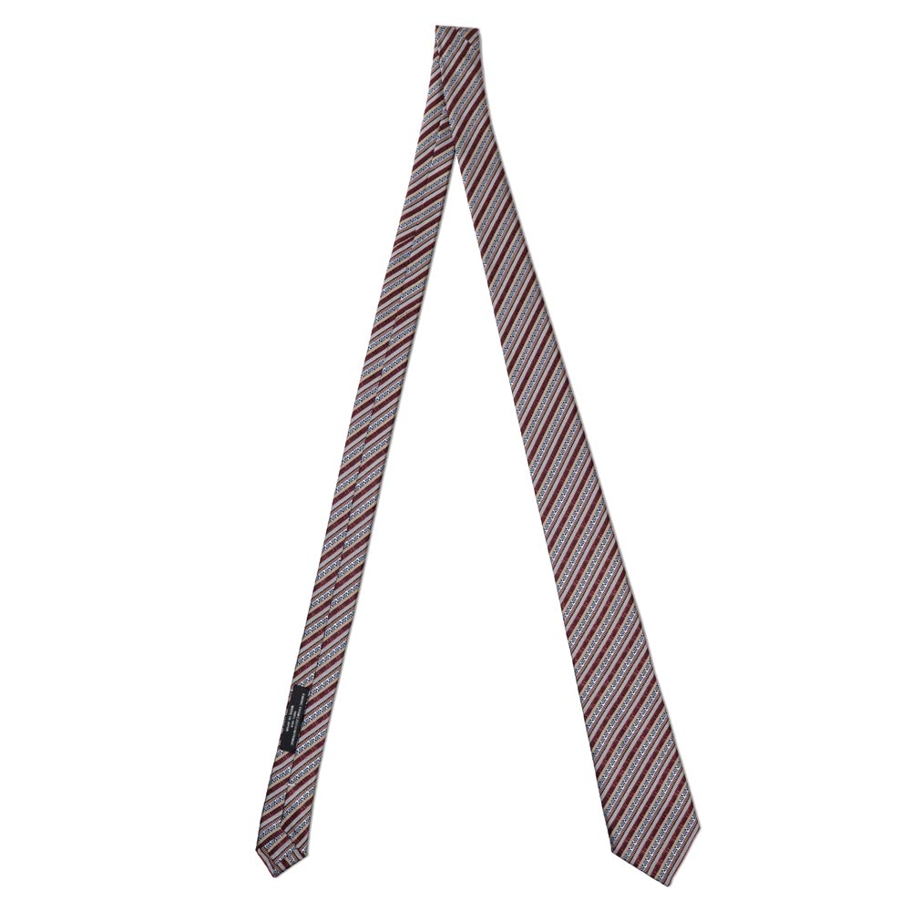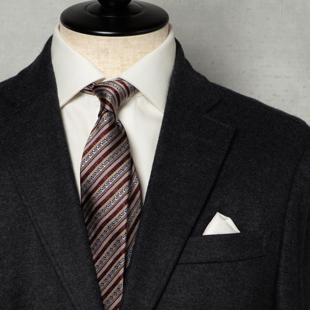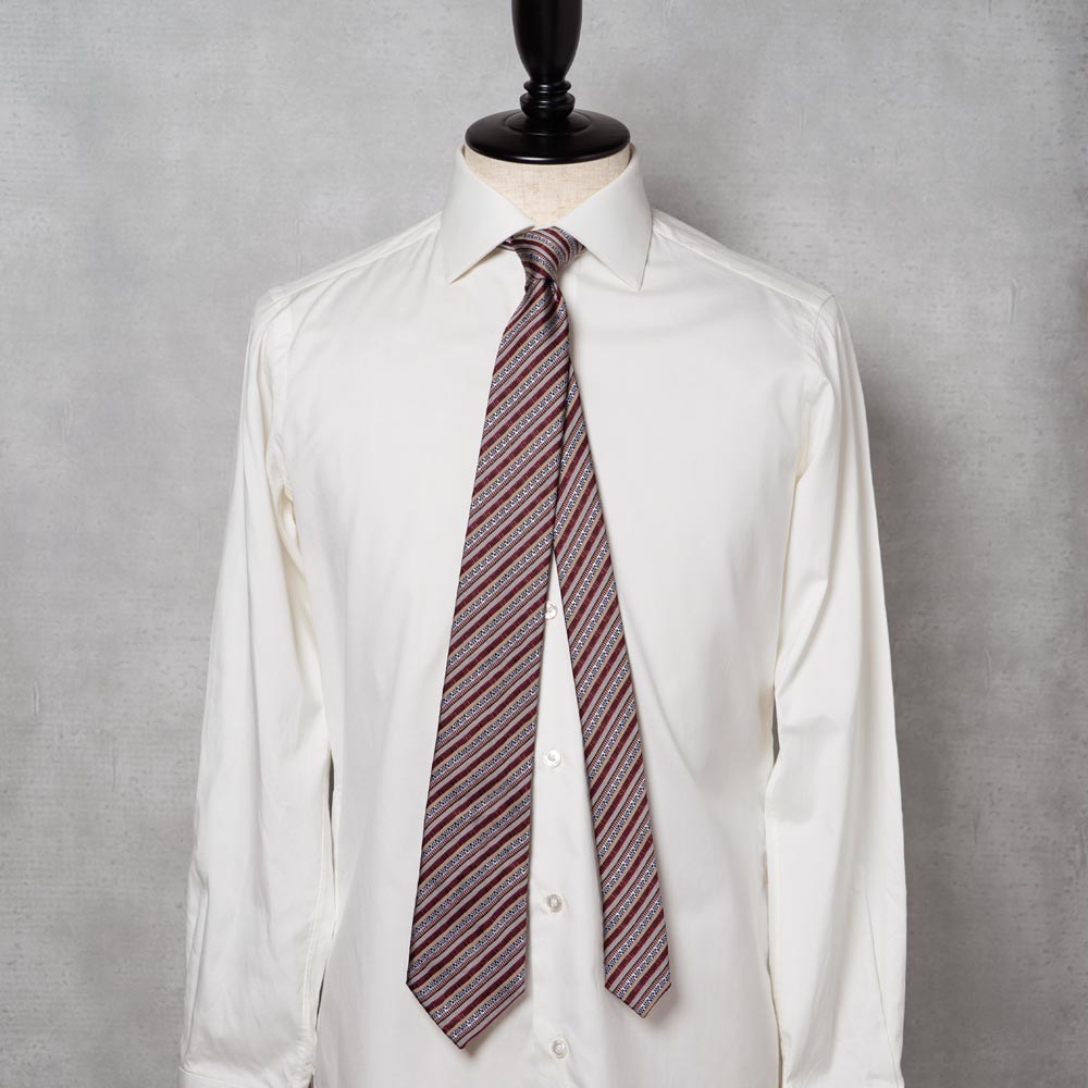 レジメンタルストライプを基調としながら、その中に細密に織り込まれた幾何学模様は、チェコ・ボヘミア地方に見られる伝統的なパターンを感じることができる一本です。