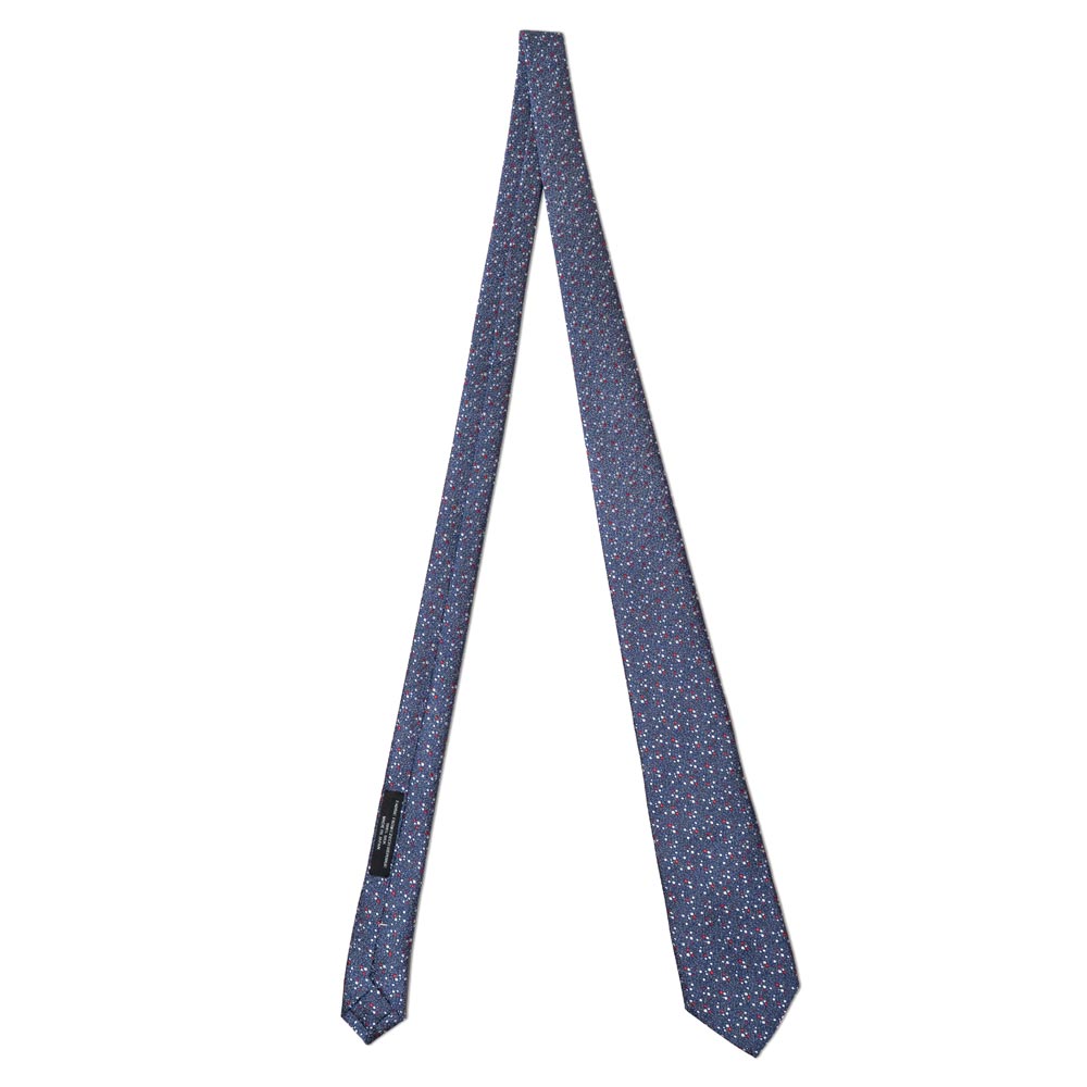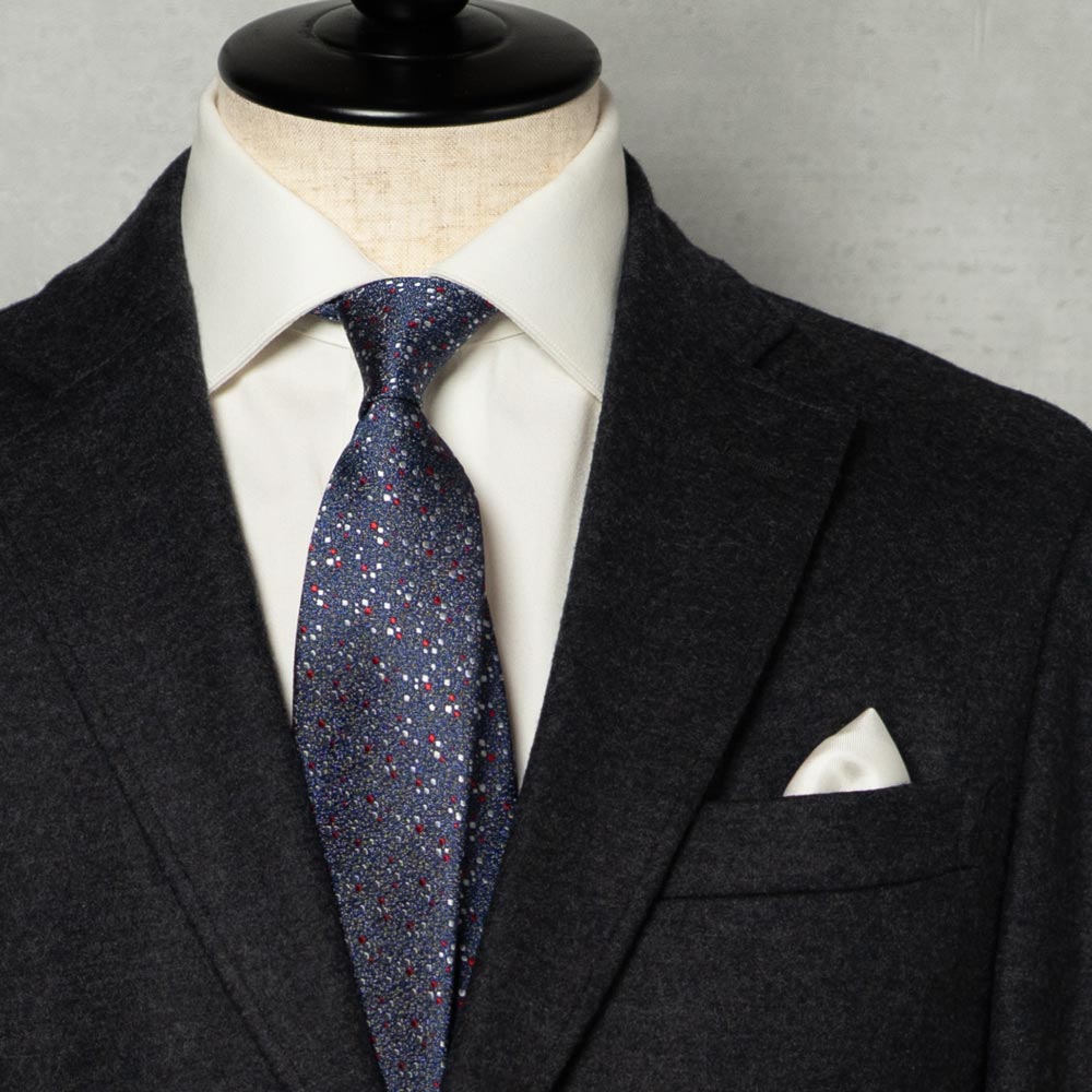 ディープネイビーの地に、赤とシルバーの小さな点が散りばめられています。緻密なジャカード織りだからこそ表現できる、細やかでランダムな点の配置がモダンな煌めきを与えます。